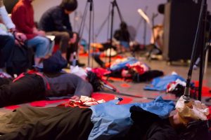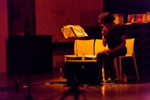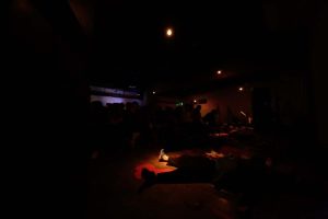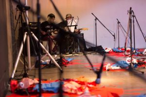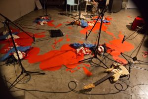 ベーシスト3名、ギタリスト3名、デスボイス担当3名+デスボイスコーラス隊十数名による、1時間以上にわたるドゥーム・メタル〜スラッジコアの演奏を中心としたパフォーマンス。楽曲は、モートン・フェルドマンの《For John Cage》のような複数の楽器の呼応関係の反復によって構成されている。会場の床には、紙の(空っぽの)死体が散乱しており、薄暗い照明が完全に落ちた時、死体は受肉して呻き声を上げては、また消えていく。 タイトルは、自分の牙が伸びすぎて自らの頭部を貫く可能性があると言われている、インドネシアに生息するイノシシ科の動物「バビルサ」からとったもの。
