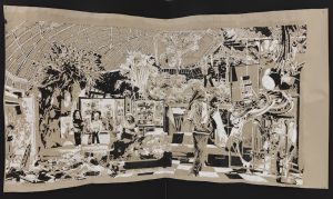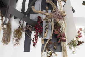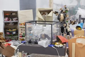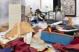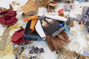 会場は2つのエリアに分かれており、第一のエリアでは散乱する紙製のゴミや生活用品の断片、その中心に腰掛ける紙製の人形、蝶番で繋がれ並立する衝立にディスプレイされた巨大なドローイング、壁面に立て掛けられた人工植物を模したオブジェクト、実物の枯木などによるインスタレーションが展開され、第二のエリアでは映像作品『WEEKEND』が再生を繰り返し、スクリーン上でスーベニアジャケットに身を包み過去の記憶を再現する人々と、徘徊するゴミや幽霊たちが「退屈の音楽」を奏でている。